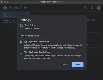 After selecting Streamed files, Google will ask you to add a folder. Select the folder you created in Step 1, check “Sync with Google Drive” and click “Done”. If your folder contains photos, you can do nothing and proceed as is, or create a separate folder for your photos, repeat step 3, check “Back up to Google Photos” and click “Done”.