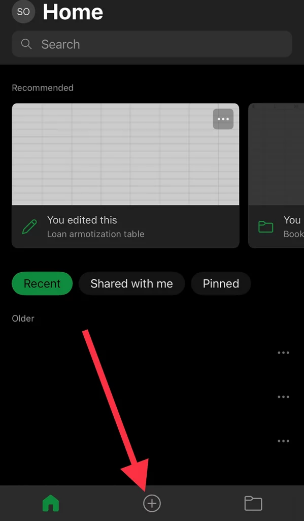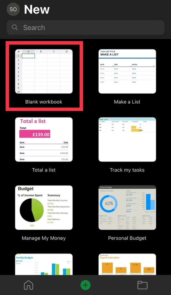 Open the Excel app on your phone and click the plus (+) sign in the bottom center