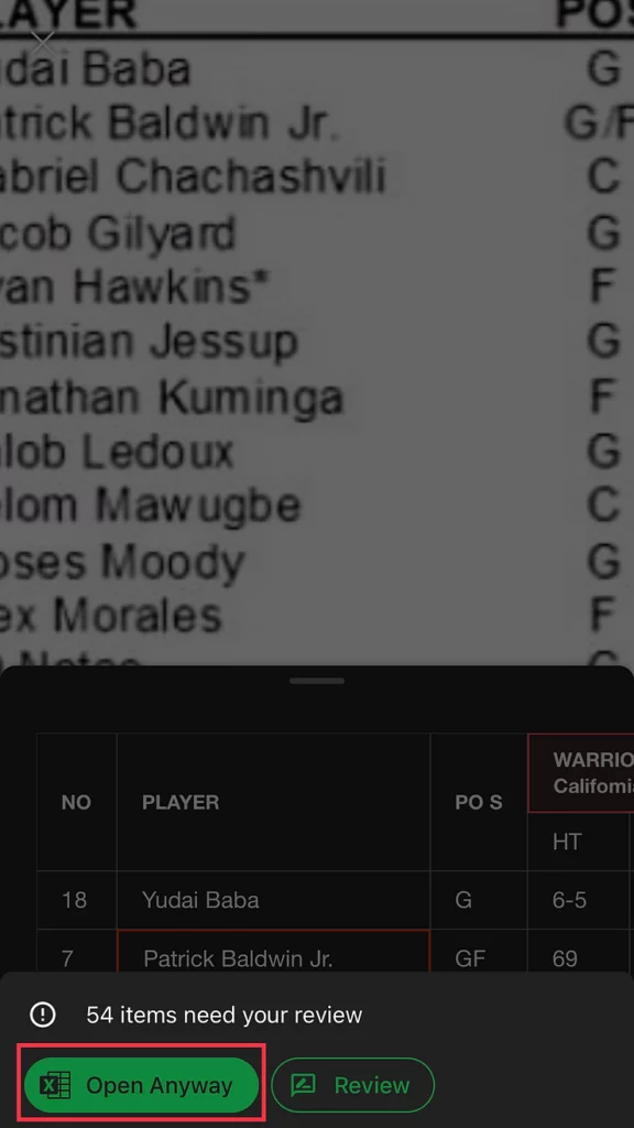 Excel will ask you if you want to review all the highlighted items or just import the data as it is. For the sake of this article, I click Open Anyway but in a real-life scenario, Review the data to ensure it is accurate