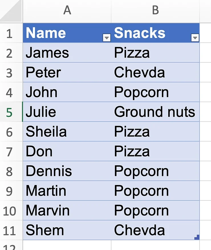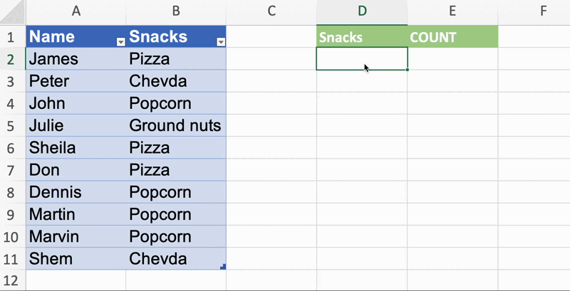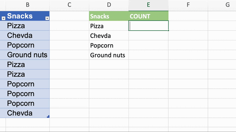 Now that we have the unique values, we want to place the count of each snack in the column adjacent to the snacks column. We will use the COUNTIFS function.