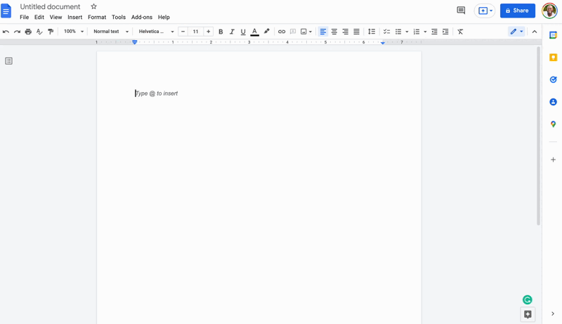 However, after the most recent updates to Docs in Google Workspace, Google is leveraging its elite ecosystem to make our work easier and more enjoyable. Therefore, instead of setting up the document manually as we did above, we now use Smart chips. You will notice that when you open the new Google Doc, you see “Type @ to insert”. “@” is the activator for Smart chips which allows you to use any features in the Google Doc.